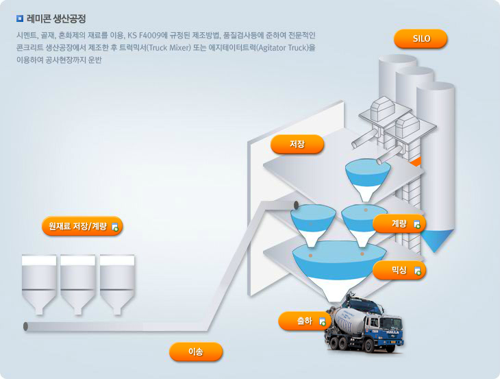 믹싱은 1회분씩 질량으로 계량한 재료를 투입하여 콘크리트가 균등하게 될 때까지 충분히 혼합시켜 균일한 상태로 배출하며,